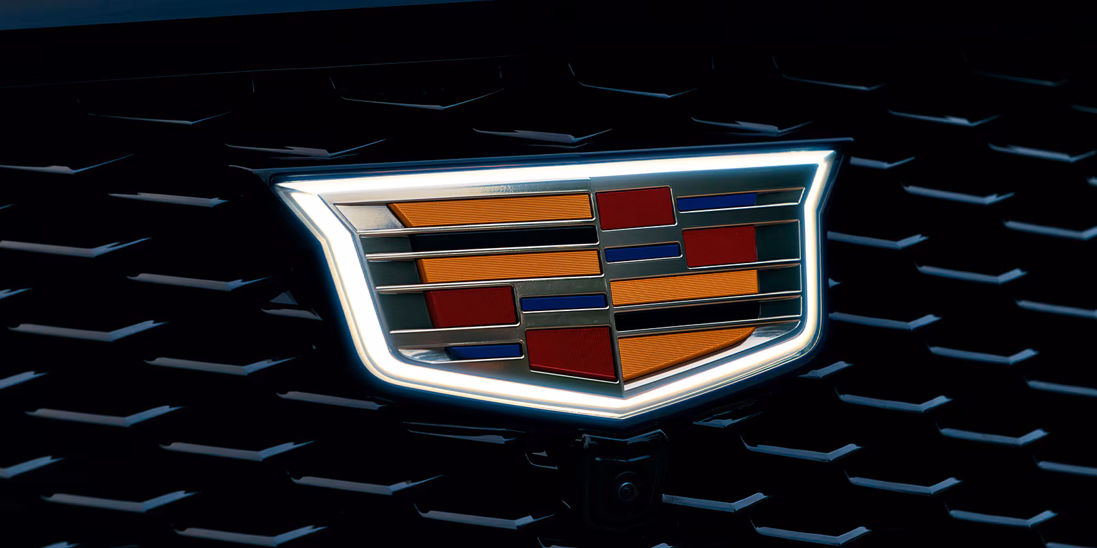 Parrilla deportiva iluminada con el emblema de Cadillac.